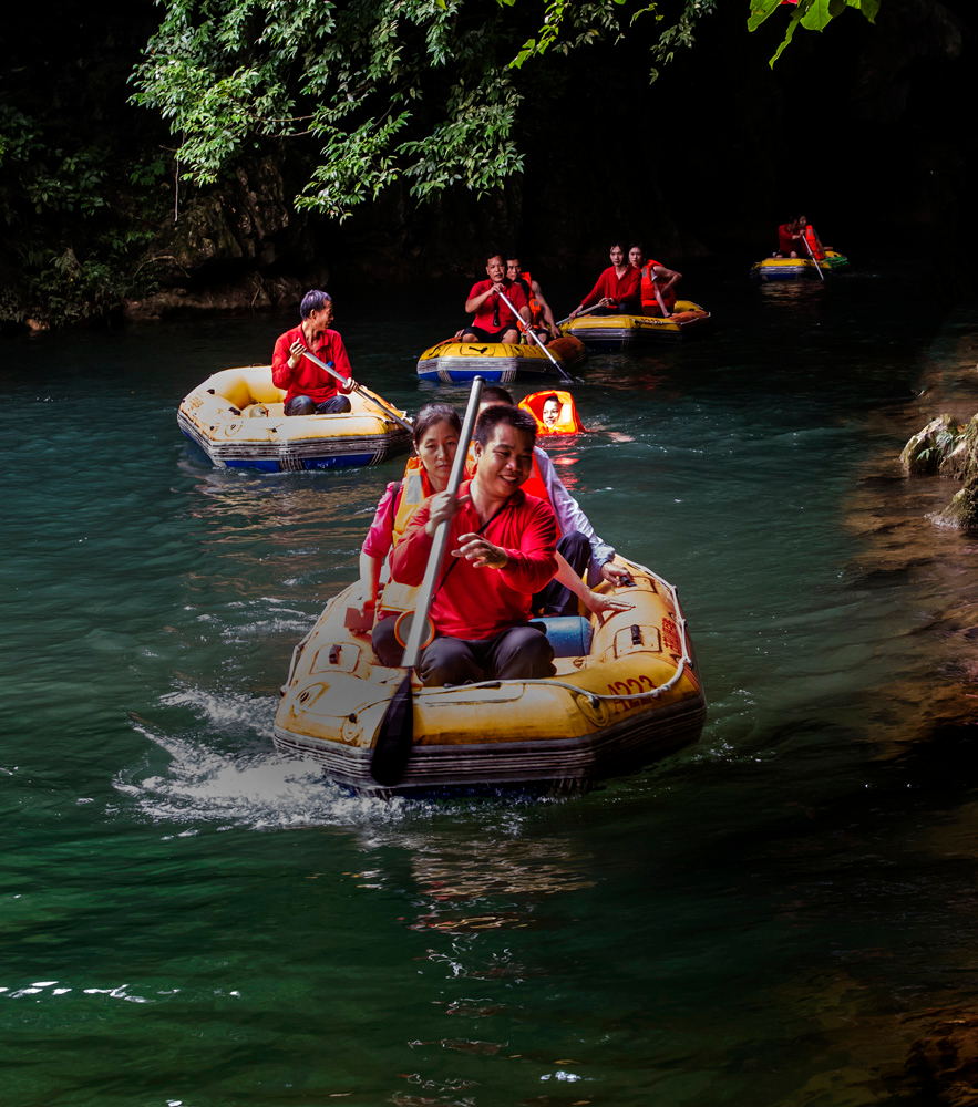 古龙山峡谷群 位于靖西城南32公里,峡谷长约6.8公里,宽100米,峡谷自然植被丰富,溪流常年不断,景色幽雅,是生态和水上漂流的好地方,峡谷包括1.5公里明河及600米暗河,谷底水流湍急,两岸植被丰富,均为亚热带原始植被,在峡谷上段还有一个溶洞暗河,暗河长600米,洞高10—30米,宽20米,洞底水流平稳,洞顶有丰富的钟乳石,有的似莲花,有的象动物,形态各异,最绝的是有几处有水从洞中往下喷出,里面犹安装有排水管一样,景色迷人。