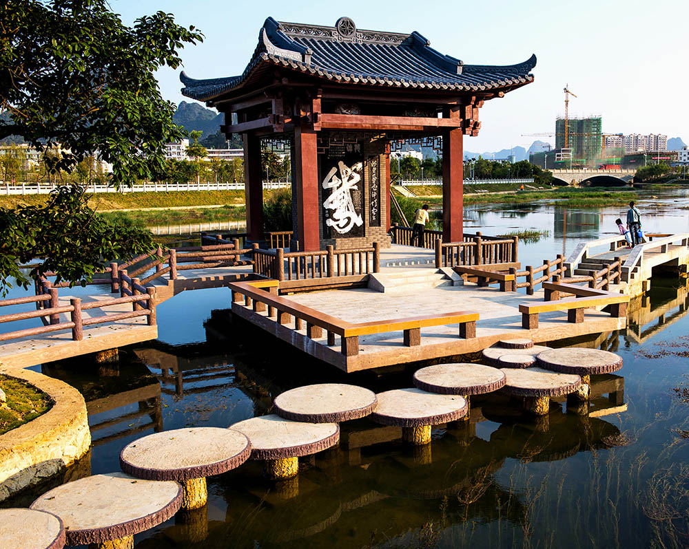 十九渡风景区 位于靖西城南18公里处,河面宽阔,有一座古桥,桥有十九孔,河中滩多水急,有许多大大小小的瀑布,还有形状各异的石头,景色怡人,河两岸翠竹青青,田园如画,可以漂流、游泳、渡假、垂钓、烧烤等,是一处秀丽的自然景观。