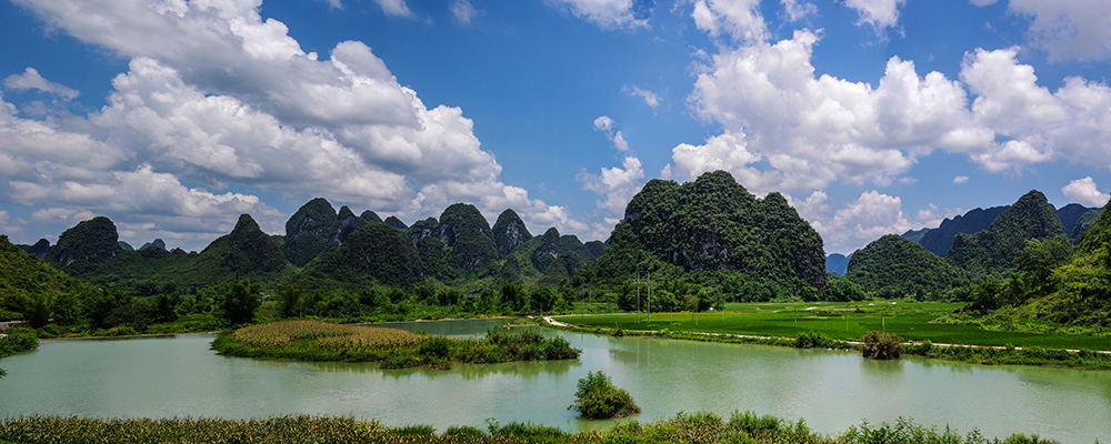 渠洋湖 位于靖西城北部约28公里,建于1958~1961年,库长15公里,库区水面积333平方公里,总库容9228万立方米,因修建在岩溶山区,淹浸许多山丘,形成青山环抱、大小岛屿点缀湖面的优美山林湖泊景观。该湖南北对称,山环水绕,湖水清澈,秀峰如林,水面烟波浩渺,孤岛星罗棋布,翠竹、壮寨镶缀其间,山水相映,景致迷人。