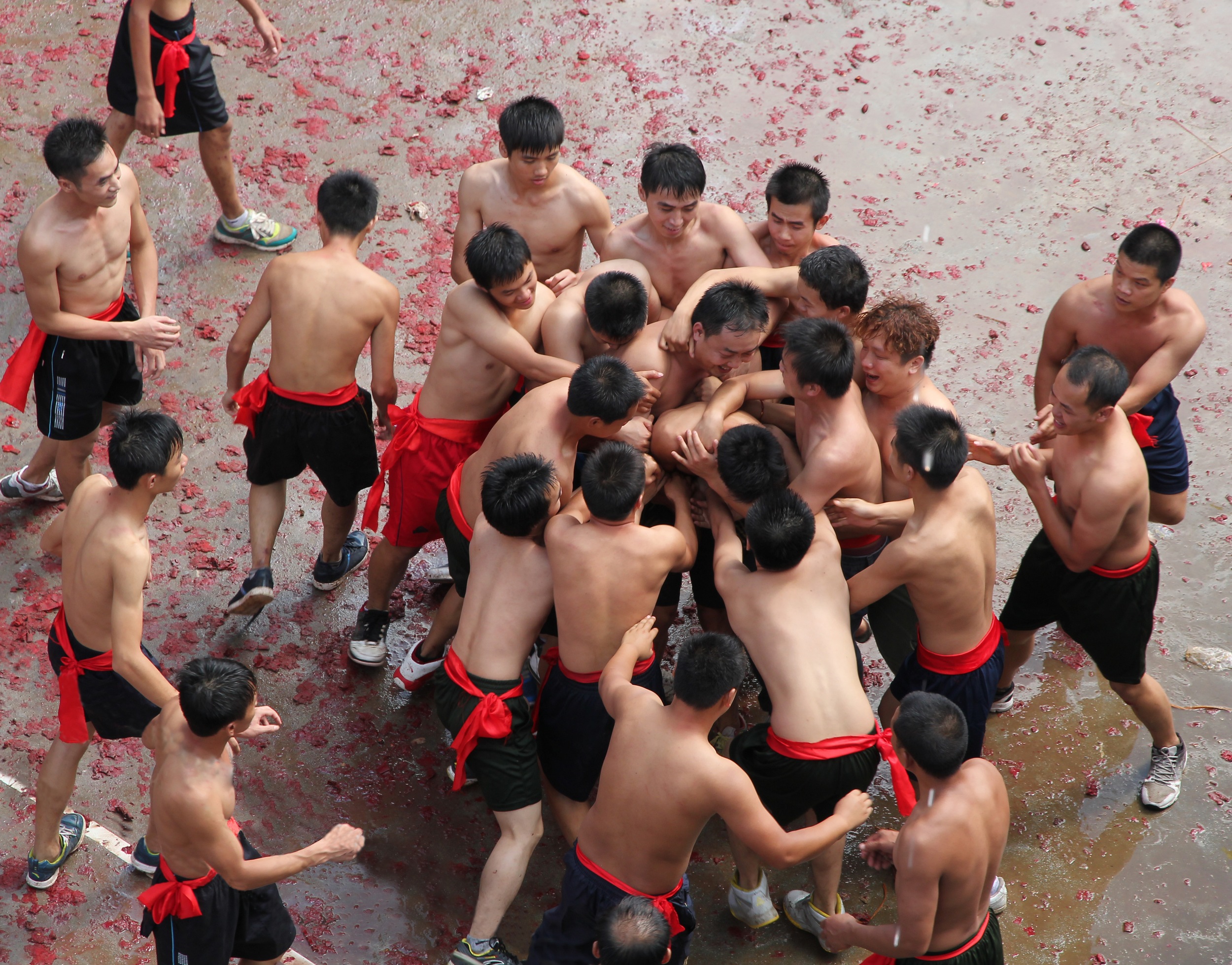 抢花炮 靖西壮族一种民间传统活动,在农历二月某天举行花炮会,制花圈、筑高台,置三大纸炮,炮中有花圈,在宽广场地上点燃纸炮,炮响花圈腾空,花炮下落时,大家竟抢,抢得花圈则被视为吉祥如意的幸运者,得到重奖。现已发展为一项民族体育活动。