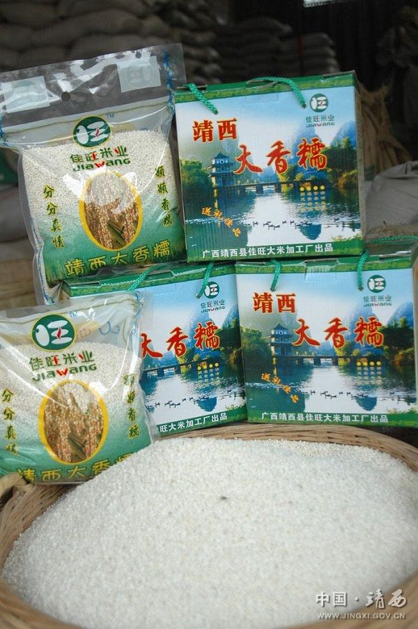 靖西大香糯米质洁白,颗粒圆大光泽,以色、香、味著称,尤以香取胜。煮熟的香糯饭雪白如玉,油光铮亮,质地柔软,粒大匀称,放置几天也不会变硬变叟。食之有入口备甜、落口缠绵、下肚柔软之感,素有“一家煮糯,十家飘香”之美誉。香糯性温热、味甘,具有补血壮阳的滋补佳品。香糯还可制成多种美味的食品,如粽粑、凉粽、糍粑、汤圆、甜酒等。大香糯自宋代起就由靖西县劳动人民培育种植,大香糯米曾被列为朝庭贡品,建国后又多次上调中央及自治区招待外宾。1972年国务院指定用靖西大香糯招待美国总统尼克松,美国贵宾吃后赞不绝口。