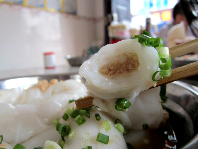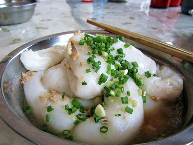 卷筒粉,先是用精选大米浸泡后磨或打成米浆,后加入适量米糊搅匀,再通过热锅蒸煮成薄薄的一块块园形粉片,接着用抹上花生油的专用竹刀快捷地从热蒸茏布上捞出来,并趁热在粉片中加入诸如或木耳或芹菜或韭菜