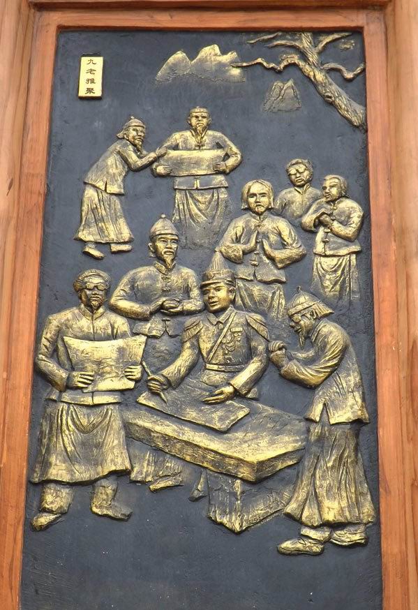 民国12年(1923年),武鸣人陆荣廷(曾任两广总督时任广西边防督办)前来靖西拜会昔日在靖西守备时结拜的八位故旧友人。在靖西期间县城的其他九老成员轮流宴请陆荣廷,排场极盛。附庸风雅的陆荣廷提议效仿白居易的“九老图”,和李纺作的“九老会”兴建“九老亭”于省立中学旁风光秀丽的憩园内(今新靖中心小学)。