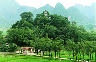 靖西宾山位于靖西城东北约1公里,靖西中学校园内,旧称滨山,取山在水边之意,后演改为宾山。