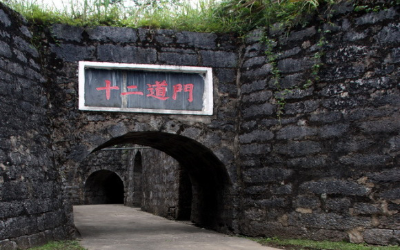 十二道门位于靖西龙邦镇南约1公里,清光绪年间,为了抗御越法军入侵广西,边防督办苏元春在广西沿边一带督建炮台、碉堡、营垒。炮台呈梅花形状,内外共有12个拱门,北门为正门,门额上刻“边民永赖”四字,炮台用大块青石筑成,门门相通,道道相连,内设粮仓、水池、弹库、隐蔽部等设施。炮台设正处炮位,设计考究,建造奇特,雄伟壮观,是广西壮族自治区重点文物保护单位。