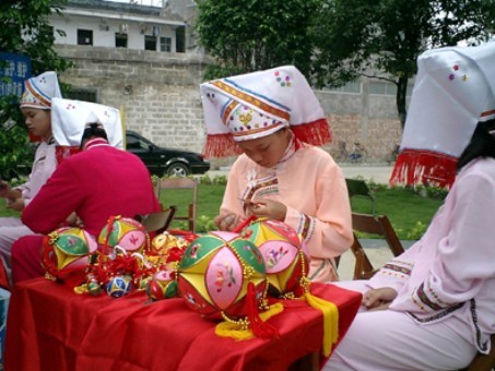 靖西绣球原来分为两大类,一是刺绣类,作为男女青年定情之用,青年男女将绣球送给意中人叫抛绣球;二是包扎类,作为民族体育活动之用,将绣球掷入坚立在高竿顶上的彩圈叫投绣球。