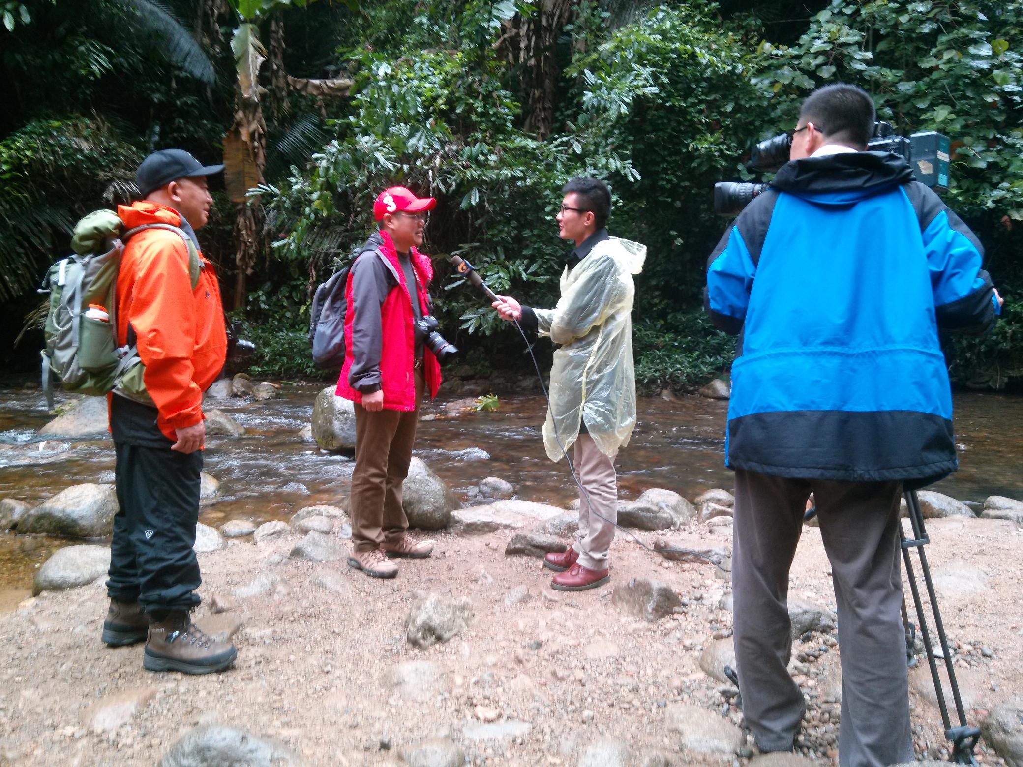 广西电视台记者在景区采访靖西旅游的江苏游客